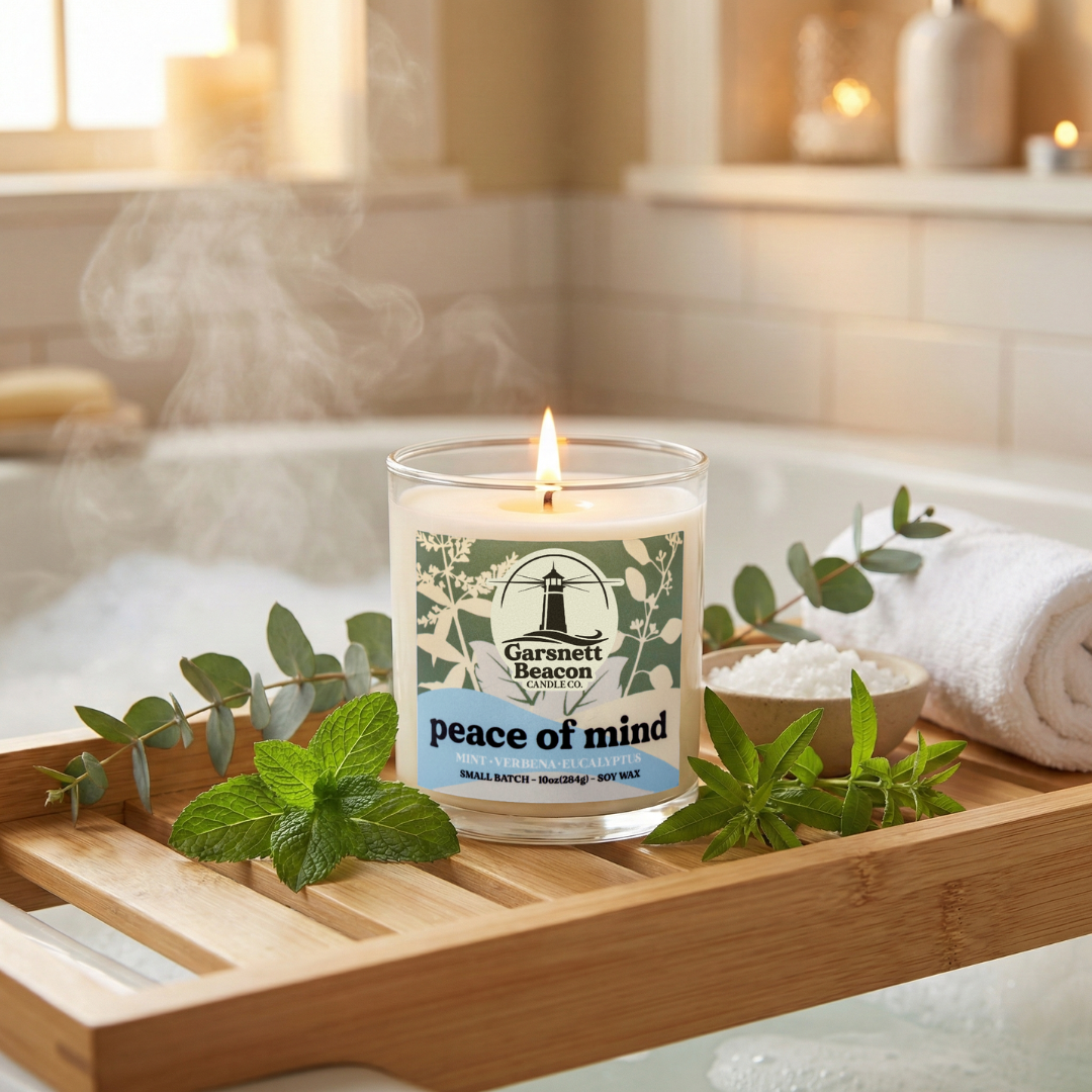 Discover the therapeutic essence of our "Peace of Mind" Candle, designed to offer solace and clarity. This candle harmonizes the revitalizing scent of Mint, the serene touch of Verbena, and the cleansing power of Eucalyptus, creating an aromatic sanctuary that nurtures the soul.