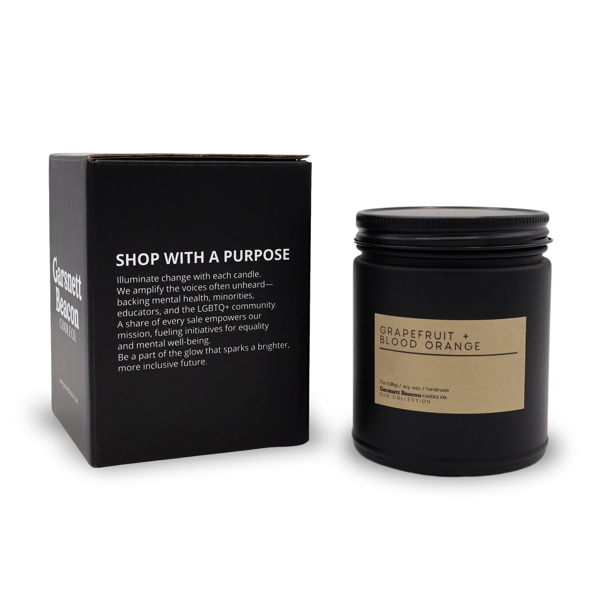 Energize your space with the vibrant Grapefruit + Blood Orange candle from the DUO collection by Garsnett Beacon. This invigorating candle combines the tartness of grapefruit with the sweet zest of blood orange, accented by a crisp citrus peel and a refreshing hint of verbena. The result is a lively, refreshing fragrance that brightens any room and uplifts the spirit. Encased in a sleek matte black container with a matching lid, this candle is not just a source of delightful fragrance but also a stylish addition to any decor.